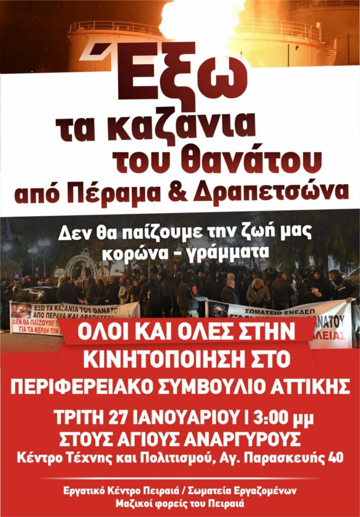 Σας στέλνουμε την πρόταση που ψηφίστηκε από τους φορείς και τα σωματεία στην Πλ. Ηρώων για τα ΚΑΖΑΝΙΑ ΤΟΥ ΘΑΝΑΤΟΥ και το οποίο έγινε ομόφωνα αποδεκτό στο Δημοτικό Συμβούλιο τη Δευτέρα 19.01.2026 Καλούμε όλους τους γονείς, εκπαιδευτικούς, κατοίκους της πόλης μας στην κινητοποίηση στο Περιφερειακό Συμβούλιο Αττικής την Τρίτη 27 Ιανουαρίου στις 3.00 μ.μ στους […]