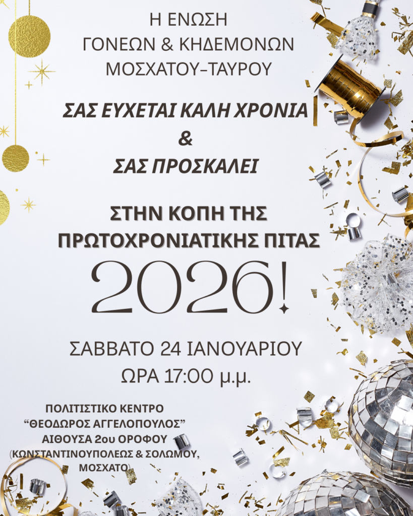 Σάς περιμένουμε όλους στην εκδήλωσή μας το Σάββατο 24 Ιανουαρίου, στις 17:00, στο Πολιτιστικό Κέντρο “Θεόδωρος Αγγελόπουλος” , στην αίθουσα του 2ου ορόφου (Κωνσταντινουπόλεως και Σολωμού, στο Μοσχάτο). Ένωση Γονέων και ΚηδεμόνωνΔήμου Μοσχάτου – Ταύρου