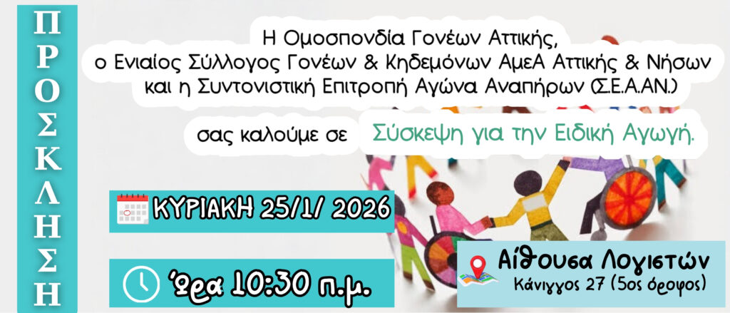 ΠΡΟΣΚΛΗΣΗ σε Σύσκεψη για την Ειδική Αγωγή Η τρέχουσα σχολική χρονιά είναι η χειρότερη σχολική χρονιά για την Ειδική Αγωγή! Ακατάλληλα ως και επικίνδυνα ειδικά και γενικά σχολεία, υποχρηματοδότηση, τεράστιες ελλείψεις εκπαιδευτικών και προσωπικού όλων των ειδικοτήτων, ακατάλληλο, ελλειπές και επικίνδυνο σύστημα μεταφοράς για τα ειδικά σχολεία. Μεγάλο πρόβλημα αποτελεί η έλλειψη δημόσιων δομών τόσο στην πρωτοβάθμια όσο και στη δευτεροβάθμια εκπαίδευση, γεγονός που έχει οδηγήσει σε υπερκορεσμένα σχολεία, σε σχολεία που δεν μπορούν να καλύψουν τις ανάγκες των παιδιών μας, με δεδομένο πως πολλές σχολικές μονάδες, έχουν ιδρυθεί μόνο στα χαρτιά! Η κατάσταση αυτή δεν μπορεί να συνεχιστεί! Πρέπει να παρθούν άμεσα μέτρα για την Ειδική Αγωγή και στα γενικά και στα ειδικά σχολεία. Για όλα τα παραπάνω, Η Ομοσπονδία Γονέων Αττικης, ο Ενιαίος Σύλλογος Γονέων & Κηδεμόνων ΑμεΑ Αττικής & Νήσων και η Συντονιστική Επιτροπή Αγώνα Αναπήρων (Σ.Ε.Α.ΑΝ.) σας καλούμε σε Σύσκεψη για την Ειδική Αγωγή. Κυριακή 25 Γενάρη – 10:30 πμ Αίθουσα Λογιστών – Κάνιγγος 27 (5ος όροφος)
