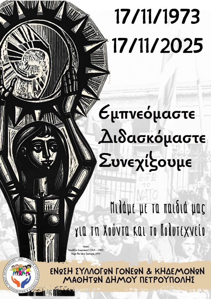 Για την 52η Επέτειο της Εξέγερσης του Πολυτεχνείου 52 χρόνια μετά την ηρωική εξέγερση του Πολυτεχνείου, τα αιτήματα για Ψωμί – Παιδεία – Ελευθερία – Εθνική Ανεξαρτησία παραμένουν τραγικά επίκαιρα. Οι γονείς, οι μαθητές και οι εκπαιδευτικοί το βιώνουμε καθημερινά στα σχολεία της Πετρούπολης: δεκάδες κενές θέσεις εκπαιδευτικών, υποστηρικτικού προσωπικού και ειδικοτήτων, παιδιά χωρίς ολοήμερο, χωρίς παράλληλη στήριξη, χωρίς βασικά μαθήματα. […]