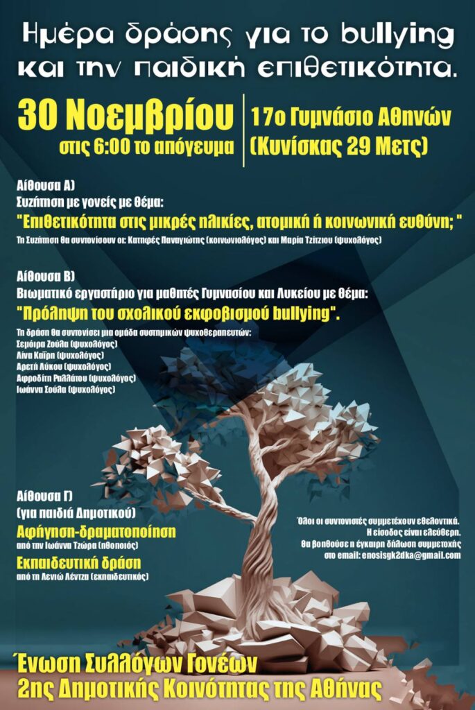 Σας προωθούμε την αφίσα για την εκδήλωση που διοργανώνει η Ένωση Συλλόγων Γονέων της 2ης ΔΚΑ με θέμα: ‘Ημέρα Δράσης για το bullying και την παιδική επιθετικότητα῾,στις 30/11/2024 στις 6μμ. στο 17ο Γυμνάσιο Αθηνών (Κυνίσκας 29 Μετς). Η συμμετοχή είναι ελεύθερη. Θα βοηθούσε η έγκαιρη δήλωση συμμετοχής στην παρούσα ηλεκτρονική διεύθυνση. Με εκτίμηση, Το ΔΣ