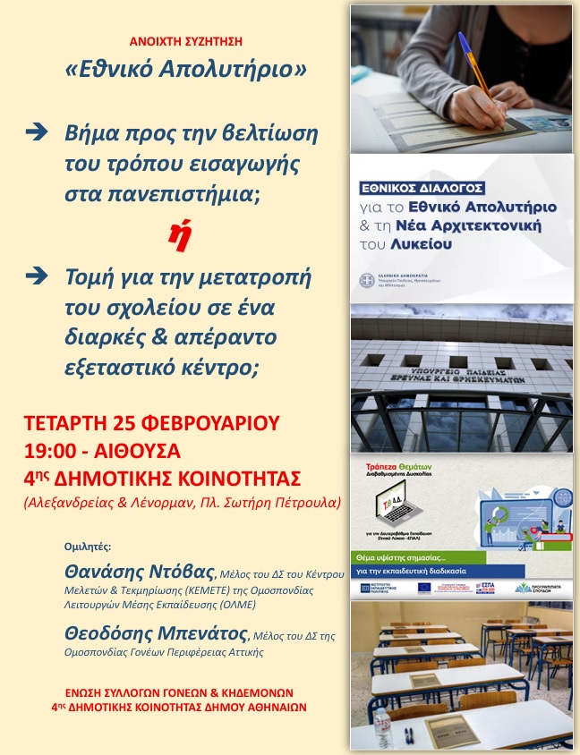 «Εθνικό Απολυτήριο» Βήμα προς την βελτίωση του τρόπου εισαγωγής στα πανεπιστήμια; ή Τομή για την μετατροπή του σχολείου σε ένα διαρκές & απέραντο εξεταστικό κέντρο; ΤΕΤΑΡΤΗ 25 ΦΕΒΡΟΥΑΡΙΟΥ – 19:00 ΑΙΘΟΥΣΑ 4ης ΔΗΜΟΤΙΚΗΣ ΚΟΙΝΟΤΗΤΑΣ (Αλεξανδρείας & Λένορμαν, Πλ. Σωτήρη Πέτρουλα) Ομιλητές: Θανάσης Ντόβας, Μέλος του ΔΣ του Κέντρου Μελετών & Τεκμηρίωσης (ΚΕΜΕΤΕ) της Ομοσπονδίας Λειτουργών Μέσης Εκπαίδευσης (ΟΛΜΕ) Θεοδόσης Μπενάτος, Μέλος του […]