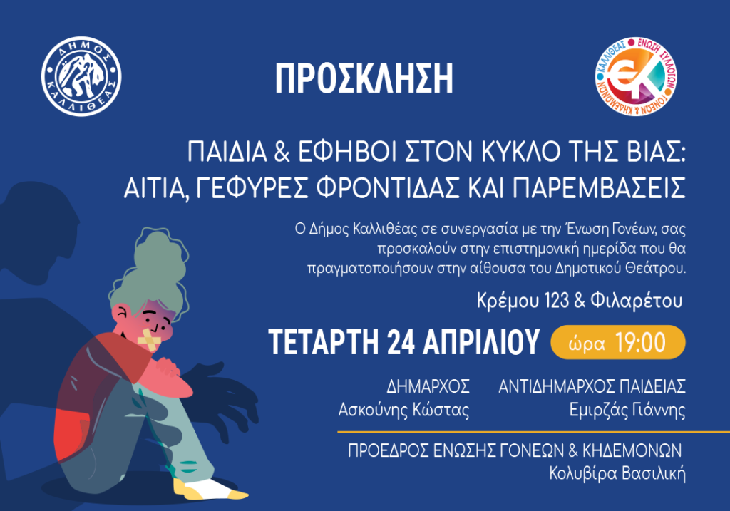 Η Ένωση Συλλόγων Γονέων Καλλιθέας σε συνεργασία με το δήμο Καλλιθέας, σας προσκαλεί στην εκδήλωση που θα πραγματοποιηθεί την Τετάρτη 24 Απριλίου 2024 στο χώρο του δημοτικού θεάτρου Καλλιθέας με θέμα ΠΑΙΔΙΑ ΚΑΙ ΕΦΗΒΟΙ ΣΤΟΝ ΚΥΚΛΟ ΤΗΣ ΒΙΑΣ