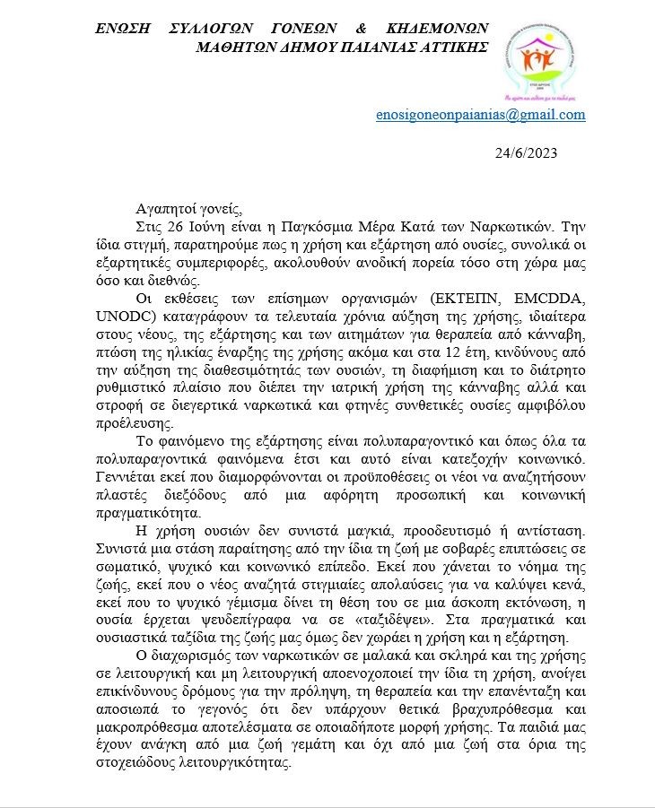 Ομοσπονδία Γονέων Περιφέρειας Αττικής Ένωση Καισαριανής: Συνυπογράφουμε το ψήφισμα της Ομοσπονδίας Συλλόγων Οικογένειας ΚΕΘΕΑ Ένωση Αιγάλεω: Ευχές για το κλείσιμο της σχολικής χρονιάς