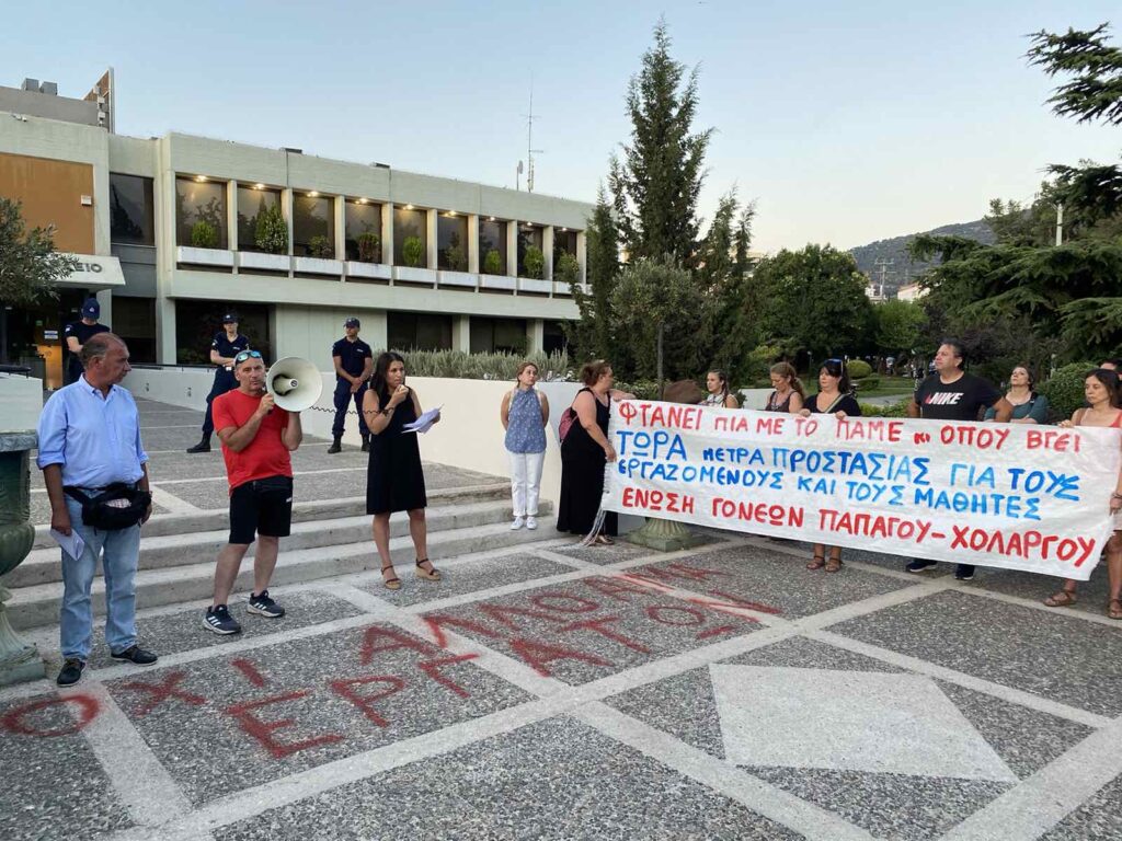 Ομιλίες πραγματοποιήθηκαν έξω από το σχολείο από τον Γιώργο Κώτη μέλος του Δ.Σ. του συλλόγου εργαζομένων του Δήμου, την Άιντα Γκικουρία μέλος του Δ.Σ. του ΣΕΠΕ «Περικλής» τον Ερνέστο Τσακαλία, Προέδρου του Συλλόγου Γονέων 1ου Δημοτικού Παπάγου και μέλους του Δ.Σ. της Ένωσης Γονέων που τόνισε ότι η συγκέντρωση αυτή αποτελεί καμπανάκι κινδύνου ώστε να παρθούν μέτρα, να αγωνιστούμε κάτι τέτοιο να μην ξανασυμβεί. Στο Δημαρχείο ,επίσης, μίλησαν ο Σπύρος Κωνσταντάς Πρόεδρος του συνδικάτου ΟΤΑ Αττικής και η Πρόεδρος της Ένωσης Ρουμπίνη Χρονοπούλου που ανέδειξε τα προβλήματα των σχολείων λόγω των ελλιπών μέτρων προστασίας που εδράζουν στη λογική κόστους οφέλους ,στην πολιτική που ακολουθούν Δήμος και Πολιτεία και τόνισε την ανάγκη να γίνουν όλοι οι απαραίτητοι έλεγχοι και όλες οι απαραίτητες στα σχολεία του Δήμου κατά τους καλοκαιρινούς μήνες, ώστε να είναι έτοιμα να υποδεχτούν τους μαθητές τον Σεπτέμβριο με ααφάλεια( επισυνάπτεται η ομιλία).