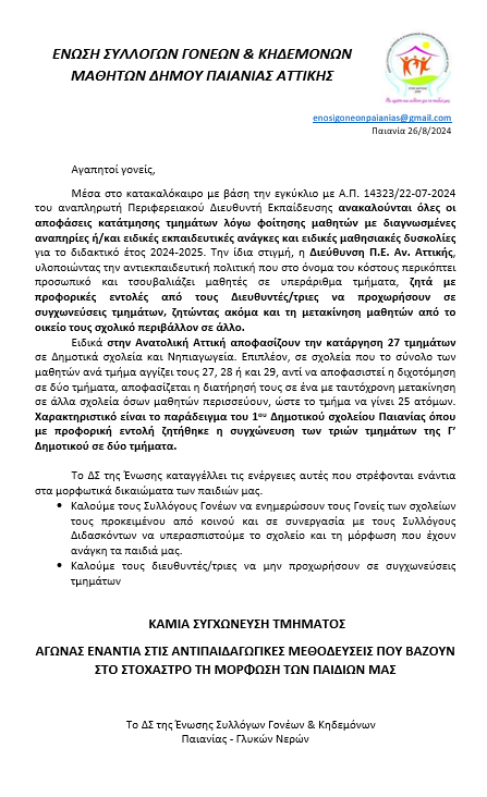 Ομοσπονδία Γονέων Περιφέρειας Αττικής Ένωση 3ης Δημοτικής Κοινότητας Αθήνας: Ανάκληση αποφάσεων κατανομής τμημάτων Ένωση Καισαριανής: Συνεχίζουμε τις κινητοποιήσεις ενάντια στις συμπτύξεις τμημάτων στα σχολεία της πόλης μας