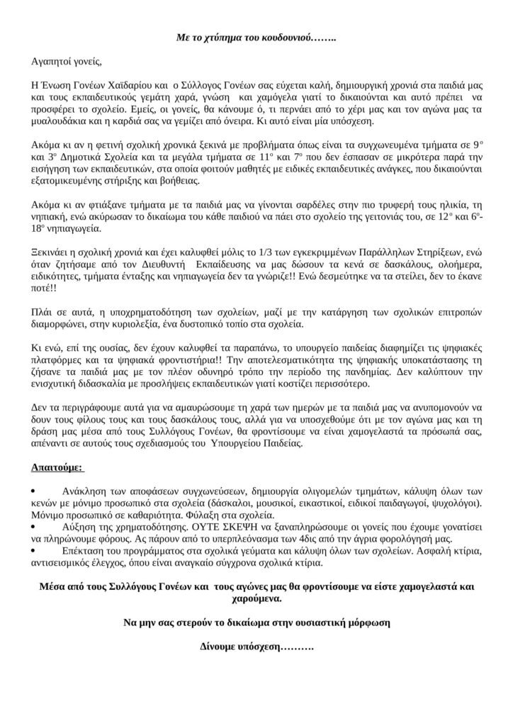 Ομοσπονδία Γονέων Περιφέρειας Αττικής Ένωση Σαρωνικού: Ανακοινώσεις της Ένωσης Συλλόγων Γονέων Δήμου Σαρωνικού Ένωση Περιστερίου: Δελτίο Τύπου ενάντια στην κατάργηση τμημάτων λυκείων