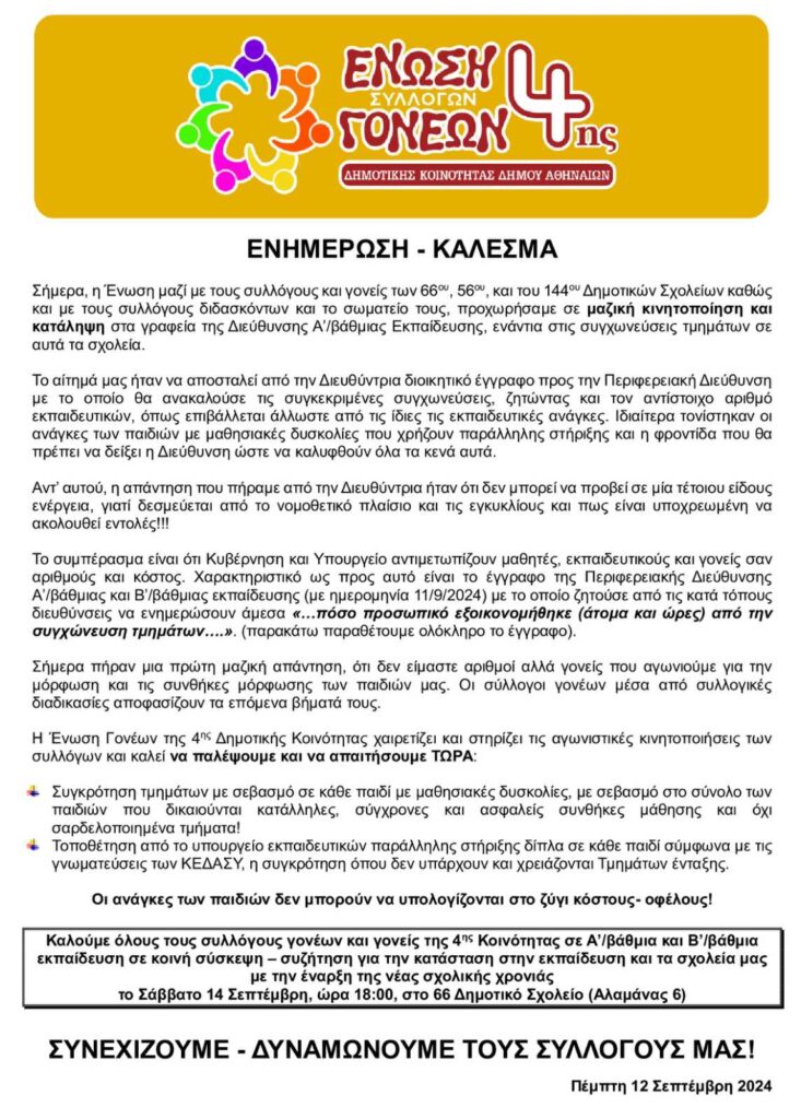 Ομοσπονδία Γονέων Περιφέρειας Αττικής Ένωση Καισαριανής: Επιστολή σχετικά με την Έγκριση λειτουργίας των Τομέων και των Ειδικοτήτων στο 1ο ΕΠΑΛ Καισαριανής Ένωση Πετρούπολης: Ενημέρωση για τις Εκλογοαπολογιστικές Συνελεύσεις, έναρξη των εκλογικών διαδικασιών