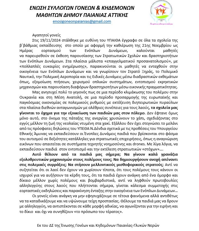 Ομοσπονδία Γονέων Περιφέρειας Αττικής Ένωση Περιστερίου: Ανακοίνωση για τη συγχώνευση νηπιαγωγείων στο Περιστέρι Ένωση Ηρακλείου Αττικής: Ανακοίνωση για το Δημοτικό Συμβούλιο 19/11