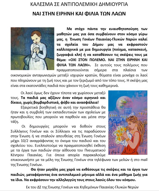 Η Ένωση Συλλόγων Γονέων & Κηδεμόνων Παιανίας – Γλ.Νερών αναλαμβάνει πρωτοβουλία πολιτιστικών εκδηλώσεων απευθυνόμενοι σε μαθητές, γονείς και εκπαιδευτικούς με θέμα: