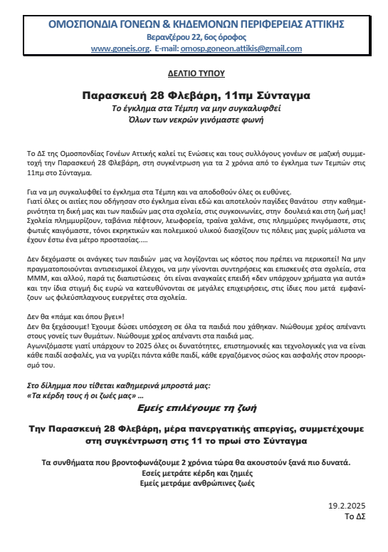Επιπλέον σας κοινοποιούμε και το σχετικό Δελτίο Τύπου της Ομοσπονδίας Γονέων Περιφέρειας Αττικής για τον ίδιο σκοπό.