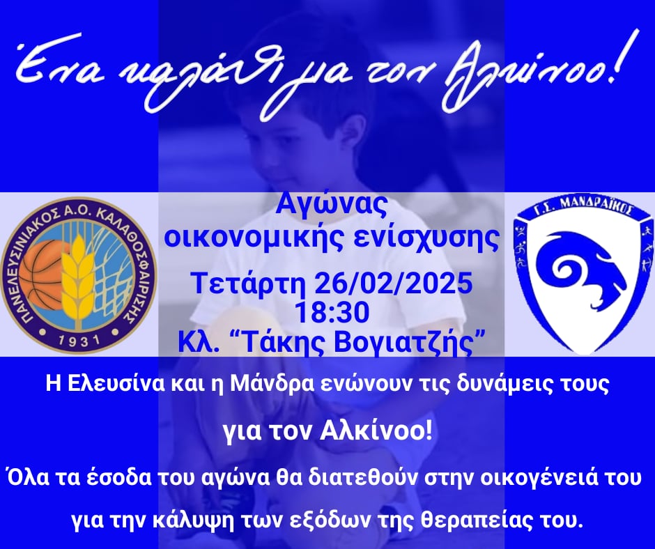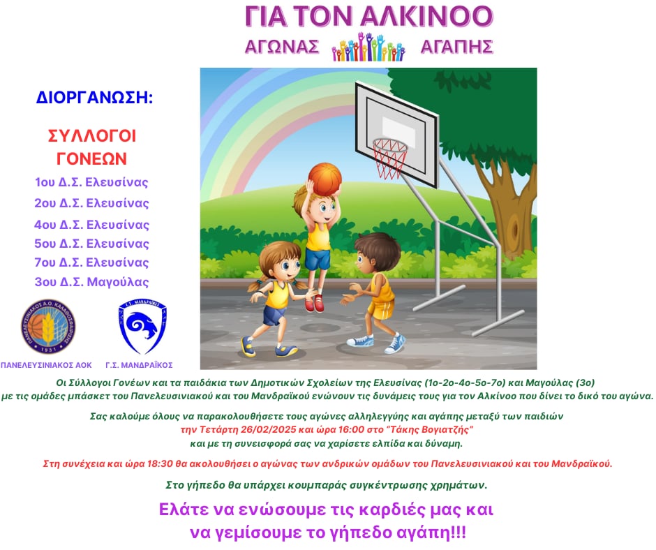 θα θέλαμε να σας ενημερώσουμε σχετικά με τον φιλανθρωπικό αγώνα Μπάσκετ που διοργανώνουν τα αθλητικά σωματεία του Πανελευσινιακού και του Μανδραϊκού και Σύλλογοι Γονέων δημοτικών σχολείων της Ελευσίνας και της Μαγούλας, έτσι ώστε να συγκεντρωθούν χρήματα για να στηριχθεί ο Αλκίνοος στον αγώνα που δίνει.