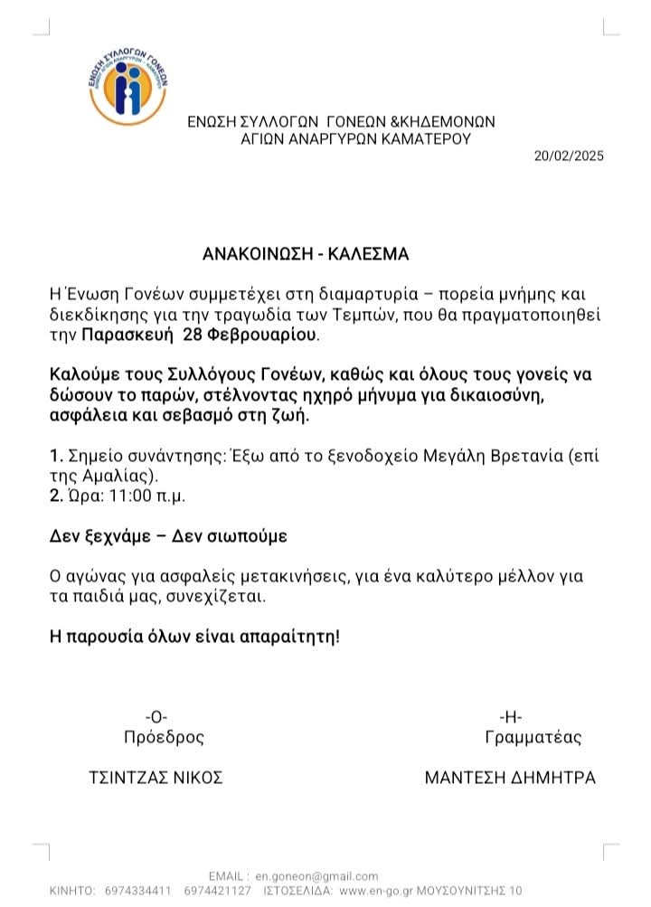 Ομοσπονδία Γονέων Περιφέρειας Αττικής Ένωση Σπάτα-Αρτέμιδας: Απόφαση για συμμετοχή στην διαμαρτυρία – απεργία 28 Φλεβάρη Ένωση 2ης Δημοτικής Κοινότητας Αθήνας: ΑΝΑΚΟΙΝΩΣΗ ΓΙΑ ΣΥΜΜΕΤΟΧΗ ΣΤΗΝ ΑΠΕΡΓΙΑΚΗ ΣΥΓΚΕΝΤΡΩΣΗ ΣΤΙΣ 28/2