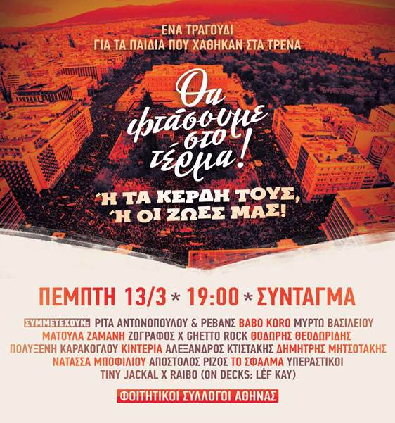 Στην μεγάλη συναυλία των Φοιτητικών Συλλόγων, την Πέμπτη 13/3, στις 7 μ.μ., στο Σύνταγμα, με τίτλο “Ένα τραγούδι για τα παιδιά που χάθηκαν στα τρένα… Θα φτάσουμε στο τέρμα! Ή τα κέρδη τους ή οι ζωές μας” και τη συμμετοχή δεκάδων καταξιωμένων τραγουδιστών, με τις συμμετοχές να αυξάνονται καθημερινά.