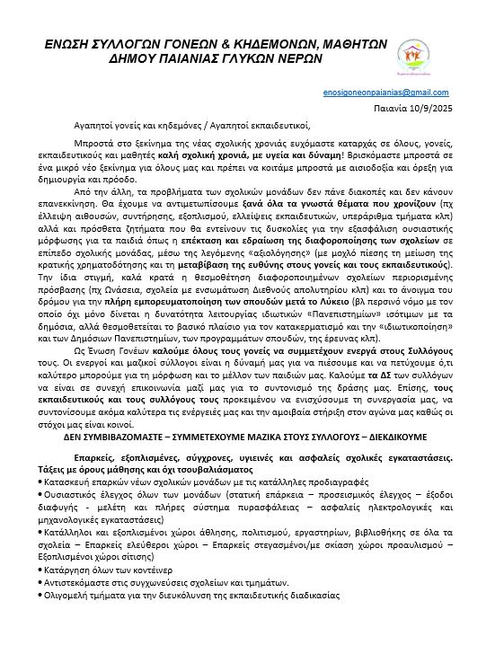 Ομοσπονδία Γονέων Περιφέρειας Αττικής Ένωση Παπάγου-Χολαργού: ΕΝΗΜΕΡΩΣΗ ΓΙΑ ΤΗ ΔΙΑΜΑΡΤΥΡΙΑ ΣΤΗΝ Δ/ΝΣΗ Α’ ΘΜΙΑΣ ΕΚΠΑΙΔΕΥΣΗΣ. ΚΑΛΕΣΜΑ ΣΥΝΕΧΙΣΗΣ ΤΩΝ ΕΝΕΡΓΕΙΩΝ ΓΙΑ ΤΗΝ ΚΑΛΥΨΗ ΟΛΩΝ ΤΩΝ ΚΕΝΩΝ ΕΚΠΑΙΔΕΥΤΙΚΩΝ. Ένωση Πετρούπολης: Εκπαιδευτικά Κενά σχολείων Πρωτοβάθμιας Εκπαίδευσης Δήμου Πετρούπολης