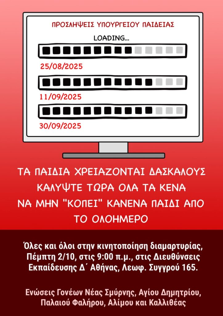 Αγ. ΔημήτριοςΛήψη Ομοσπονδία Γονέων Περιφέρειας Αττικής Ένωση Ταύρου-Μοσχάτου: Κάλεσμα σε κινητοποίηση για τα κενά και τις ελλείψεις εκπαιδευτικών Ένωση Νέας Ιωνίας: ΑΠΑΡΑΔΕΚΤΑ ΤΑ ΠΟΛΥΠΛΗΘΗ ΤΜΗΜΑΤΑ σε Γυμνάσια και Λύκεια!