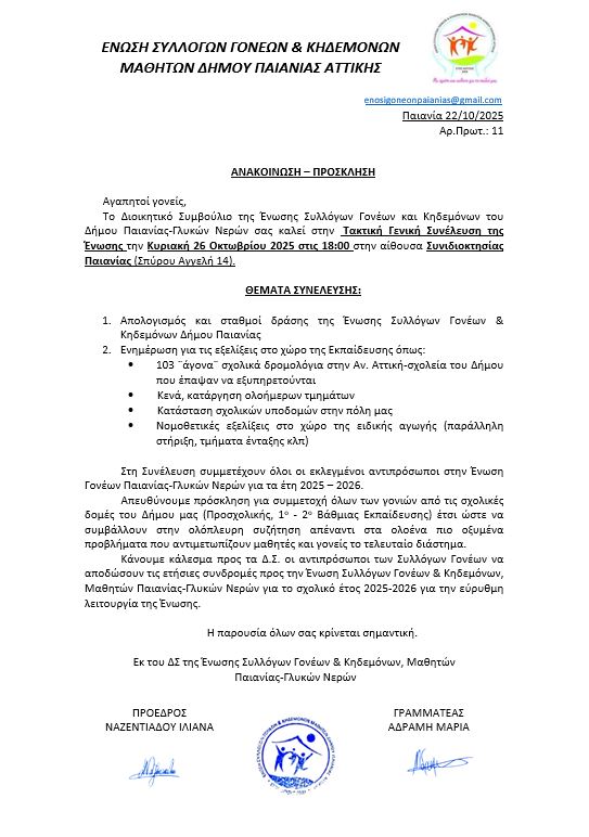 ΤΑΚΤΙΚΗ ΓΕΝΙΚΗ ΣΥΝΕΛΕΥΣΗ 26-10-2025Λήψη Ομοσπονδία Γονέων Περιφέρειας Αττικής ΚΑΛΕΣΜΑ ΤΗΣ ΠΕΡΙΦΕΡΕΙΑΚΗΣ ΑΝΑΤΟΛΙΚΗΣ ΑΤΤΙΚΗΣ ΤΗΣ ΟΜΟΣΠΟΝΔΙΑΣ ΓΟΝΕΩΝ ΣΤΙΣ ΕΝΩΣΕΙΣ ΚΑΙ ΤΟΥΣ ΣΥΛΛΟΓΟΥΣ ΓΟΝΕΩΝ ΤΗΣ Ένωση Ιλίου: ΚΑΛΕΣΜΑ ΠΡΟΣ ΟΛΕΣ ΤΙΣ ΟΜΟΡΕΣ ΕΝΩΣΕΙΣ ΓΟΝΕΩΝ