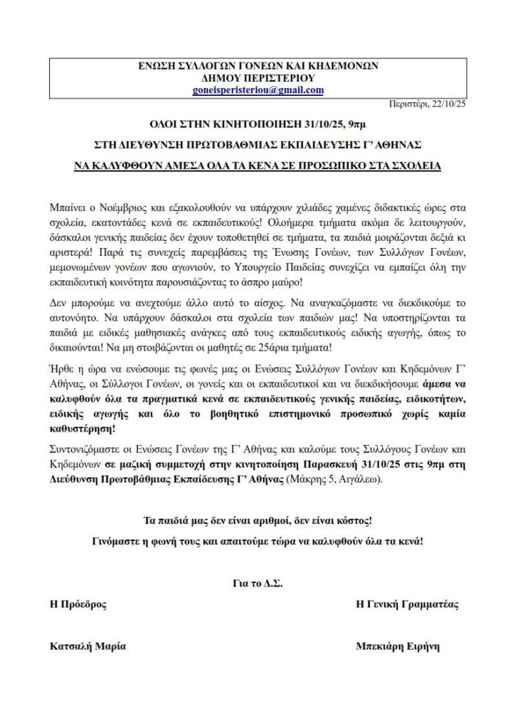 2210 Kinhtopoihsh gia ta polyarithma kenaΛήψη Ομοσπονδία Γονέων Περιφέρειας Αττικής Ένωση Χαιδαρίου: Δελτίο Τύπου από την παράσταση διαμαρτυρίας στην Γ’ Διεύθυνση Πρωτοβάθμια Εκπαίδευσης Ένωση Παπάγου-Χολαργού: ΚΑΤΩ ΤΑ ΧΕΡΙΑ ΑΠΟ ΓΟΝΕΙΣ- ΜΑΘΗΤΕΣ- ΕΚΠΑΙΔΕΥΤΙΚΟΥΣ! ΚΑΤΑΓΓΕΛΙΑ ΓΙΑ ΤΗΝ ΚΑΤΑΣΤΟΛΗ ΤΗΣ ΚΙΝΗΤΟΠΟΙΗΣΗΣ ΣΤΗ ΔΙΕΥΘΥΝΣΗ ΠΡΩΤΟΒΑΘΜΙΑΣ ΕΚΠΑΙΔΕΥΣΗΣ Α’ ΑΘΗΝΑΣ