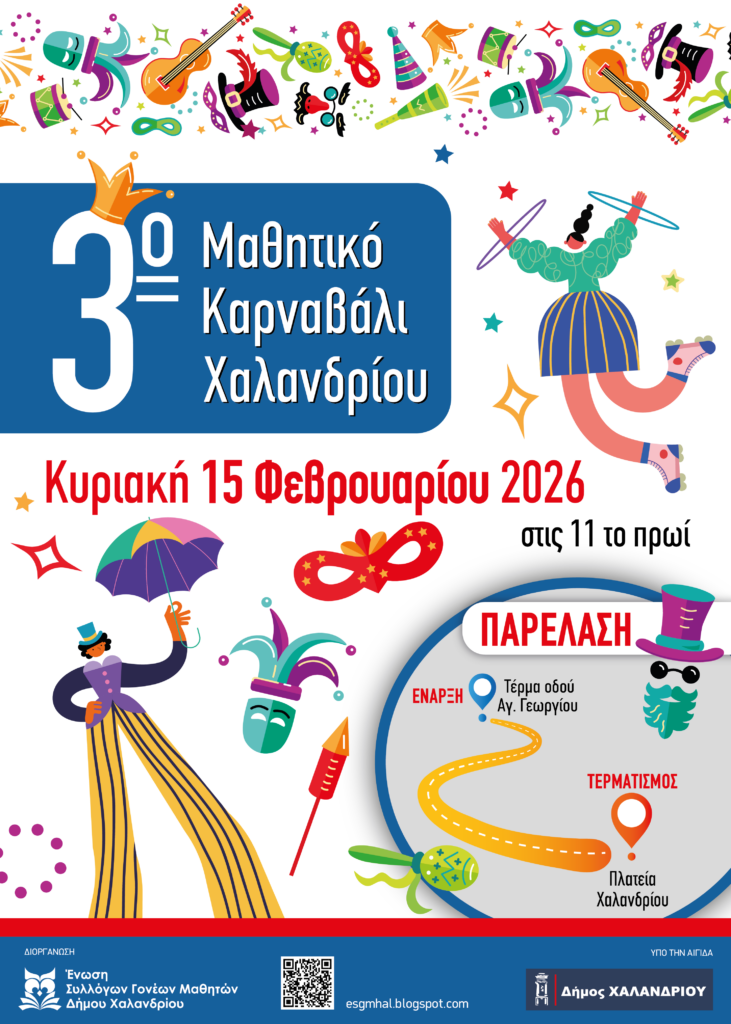 Οι δρόμοι του Χαλανδρίου ετοιμάζονται να γεμίσουν ξανά με χρώματα, μουσικές και το αστείρευτο γέλιο των μαθητών των σχολείων της πόλης. Η μαθητική καρναβαλική παρέλαση επιστρέφει και φέρνει μαζί της όλη τη χαρά και τη δημιουργικότητα που την κάνουν αγαπημένη συνήθεια για μικρούς και μεγάλους.