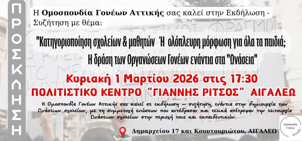 “Κατηγοριοποίηση σχολείων και μαθητών ή ολόπλευρη μόρφωση για όλα τα παιδιά; Η δράση των Οργανώσεων γονέων ενάντια στα Ωνάσεια σχολεία”