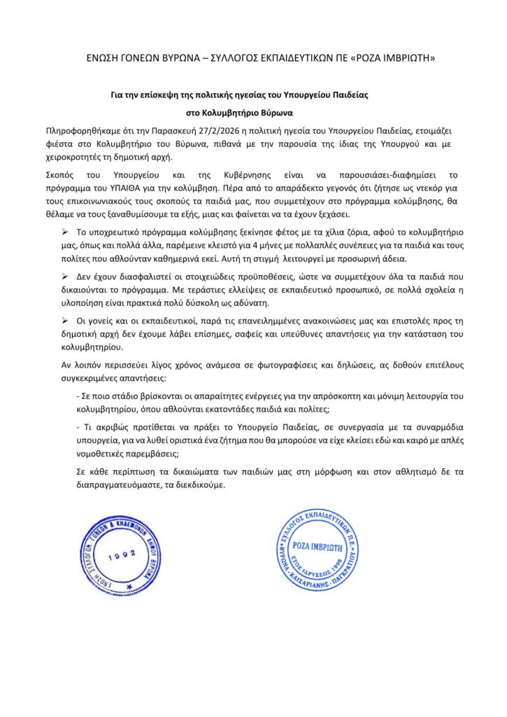 Ένωση Βύρωνα: ΚΟΙΝΗ ΑΝΑΚΟΙΝΩΣΗ ΣΥΛΛΟΓΟΥ ΕΚΠΑΙΔΕΥΤΙΚΩΝ Π.Ε. ΡΟΖΑ ΙΜΒΡΙΩΤΗ – ΕΝΩΣΗΣ ΓΟΝΕΩΝ ΒΥΡΩΝΑ Για την επίσκεψη της πολιτικής ηγεσίας του ΥΠΑΙΘΑ την Παρασκευή 27/2 στο Κολυμβητήριο Βύρωνα
