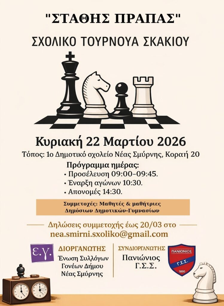 Οι δηλώσεις θα στέλνονται ηλεκτρονικά μέχρι την Παρασκευή 20/3/2026 και ώρα 23:00 στο email: nea.smirni.sxoliko@gmail.com