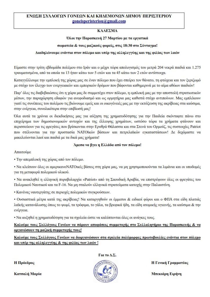 2303 Kalesma sto antipolemiko syllalhthrioΛήψη Ομοσπονδία Γονέων Περιφέρειας Αττικής Ένωση Αγίας Παρασκευής: Τιμώντας τους αγώνες, ατενίζοντας το μέλλον! Ένωση Παιανίας-Γλυκών Νερών: ΣΥΣΚΕΨΗ ΓΙΑ ΤΗΝ ΥΓΕΙΑ
