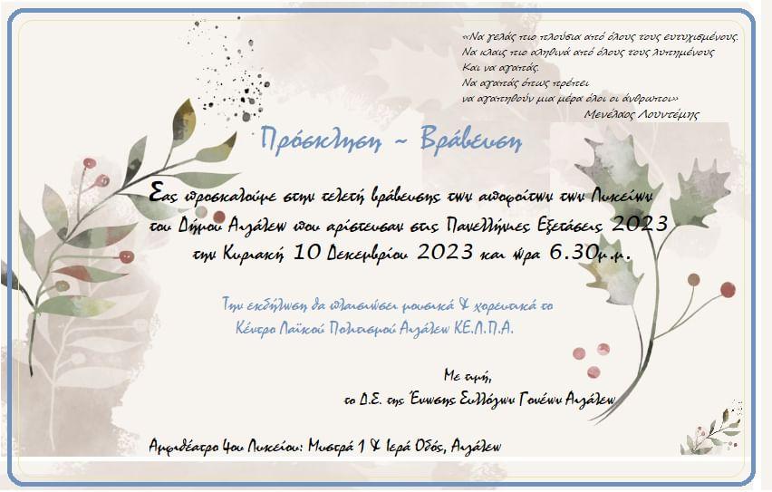 Σας προσκαλούμε στην τελετή βράβευσης των αποφοίτων των Λυκείων του Δήμου Αιγάλεω που αρίστευσαν στις Πανελλήνιες Εξετάσεις 2023!
