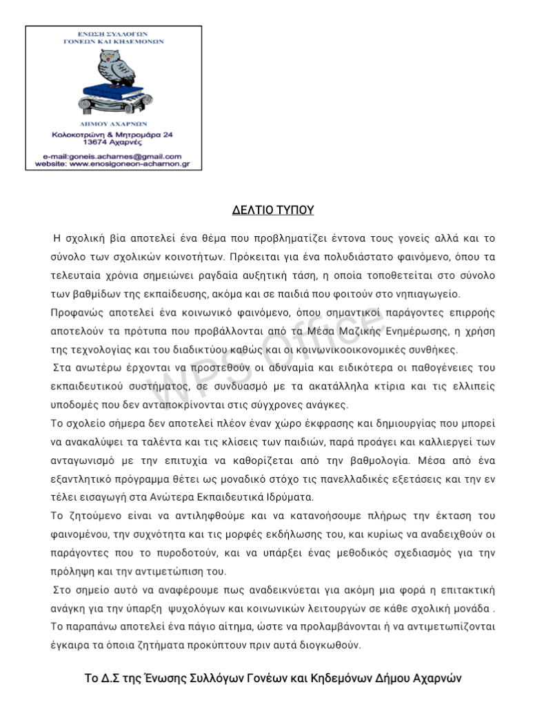 Ομοσπονδία Γονέων Περιφέρειας Αττικής Ένωση Πετρούπολης: Ενημέρωση για την παράσταση διαμαρτυρίας για τις συγχωνεύσεις Ένωση Ηρακλείου Αττικής: Δελτίο Τύπου για την εκδήλωση: Ενδοσχολικός Εκφοβισμός και Νεανική Παραβατικότητα – Αιτίες και Αντιμετώπιση